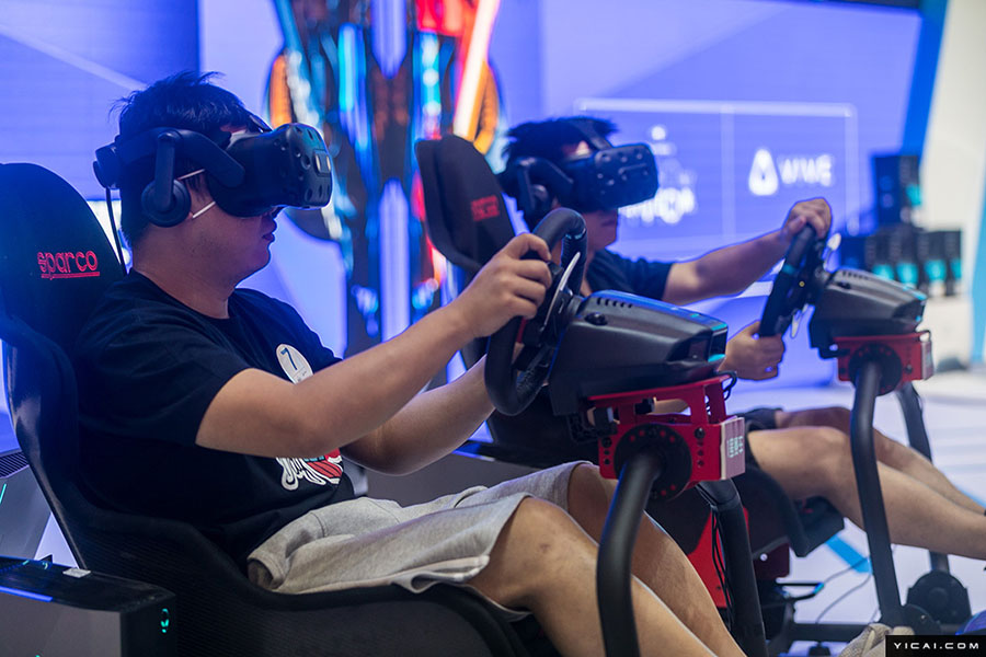 ある展示ブースでイマージョン式VRゲームを體験する來場者。