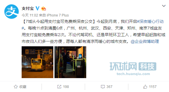 アリペイ(支付寶)は8日晝、公式微博(ウェイボー)上で、「本日から8月末まで、毎日午後11時(shí)から翌朝午前6時(shí)までの時(shí)間帯に、広州、杭州、武漢、西安、天津、鄭州、南京の7都市のユーザーは、アリペイを利用することで市內(nèi)のバスに1晩につき2回まで無(wú)料で乗車することが可能となる」と発表した。環(huán)球網(wǎng)が伝えた。