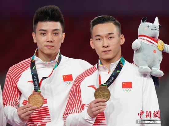 8月20日、ジャカルタ?アジア競技大會體操男子個人総合決勝および男子団體?種目別競技で、中國の林超攀選手(寫真中)が86.750點で金メダルに輝き、肖若騰選手(寫真右)は86.750點で銅メダル。(撮影?侯宇)