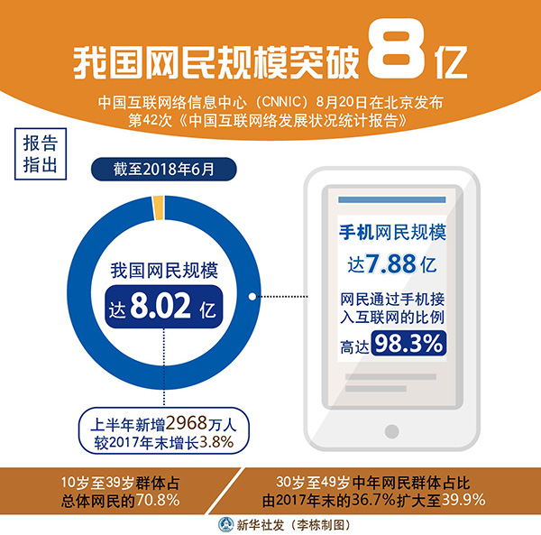 中國インターネット情報(bào)センター(CNNIC)は北京市で20日、第42回「中國インターネット発展?fàn)顩r統(tǒng)計(jì)報(bào)告書」を発表した。報(bào)告書によると、2018年6月現(xiàn)在の中國のネットユーザー數(shù)は8億200萬人に達(dá)した。上半期は2017年末比で3.8%増(2968萬人増)となり、インターネットの普及率が57.7%に達(dá)した。攜帯電話によるネットユーザー數(shù)は7億8800萬人で、攜帯電話でネット接続する割合が98.3%に達(dá)した。新華社が伝えた。