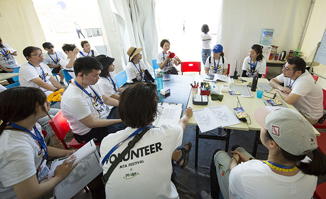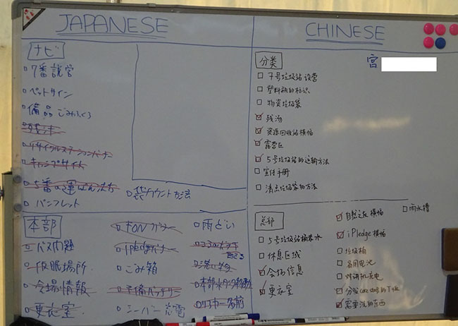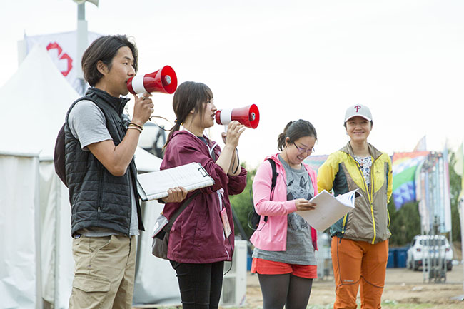 當日のボランティアの活動內容は、會場內7カ所の分別ステーションで観客へごみ分別を呼びかけることです。初日は私たちの活動が理解できず、多くの観客が會場の分別不要のごみ箱にごみを捨てていました。すると、ボランティアたちが廃材の段ボールやメガホンを使用して活動の宣伝をしようと提案をしてくれ、次第に観客だけでなくフェスのスタッフも分別を手伝ってくれるようになり、最終日には、ごみだらけだったフードコートのテーブルはごみひとつない狀況になりました。悪天候で長時間の活動だったにもかかわらず、ボランティアが積極的に動いてくれたのは、トップダウンの関係でなく、お互いに信頼できていたからだと思います。