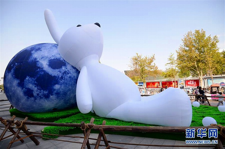 河北省邯鄲市のあるデパート前の広場では中秋節(jié)(舊暦8月15日、今年は9月24日)當日、「明月」によりかかる伝説の白ウサギ「玉兎」の巨大バルーンの前で記念撮影を楽しむ市民が多く訪れていた。新華社が伝えた。(撮影?郝群英)(編集KM)