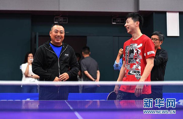 9月27日、トレーニング中の馬竜選手と談笑する劉國梁氏(左)(撮影?陶希夷)