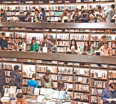 10月3日、四川省成都市の方所書(shū)店で本を選ぶ人々。このところ毎日1萬(wàn)人以上の客が方所書(shū)店を訪れている。書(shū)店をぶらぶらし、新しい本を買(mǎi)って休日を過(guò)ごす人が多い。
