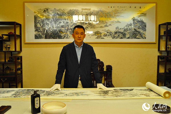 馮一束氏と作品「含章渡海東」(撮影·陶隠)。
