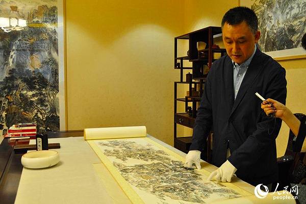 記者に巻物の一部を紹介する馮一束氏(撮影·陶隠)。