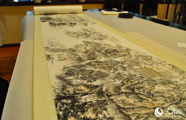 この「含章渡海東」と題されたこの水墨畫の巻物は、鑑真が6度に渡り、日本を目指して旅した物語を原型としている。長さ10メートル、幅50センチで、本紙の長さは7メートルに達(dá)する。巻物は時(shí)間をその主軸とし、そこに鑑真の幼き日から日本へ渡るまでの全過程が描かれている。