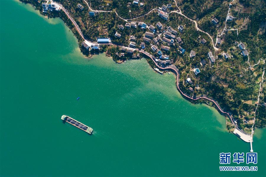 船舶が31日、長江西陵峽一帯の水域を通過した様子(ドローンで撮影)