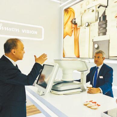 醫(yī)療機(jī)器と醫(yī)薬品?保健用品の展示エリアで、米國の企業(yè)関係者が眼科検査機(jī)器を説明していた。(撮影:黃超)