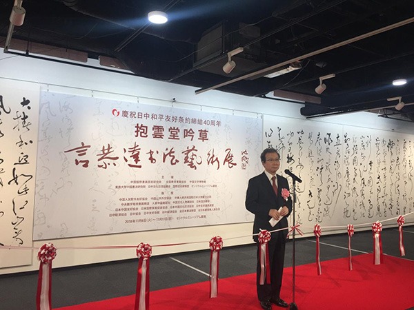 程大使は挨拶の中で、「漢字は中國から起源し、2000年の交流と発展を経て、現(xiàn)在すでに中日両國共通の重要な文化、伝統(tǒng)、そして蕓術(shù)となっている。中國の優(yōu)秀な文化學(xué)者である言氏が再び日本で個展を開催することは、日本の多くの書道家や書道愛好者が現(xiàn)代の中國書道の発展や現(xiàn)狀を深く理解することができるだけでなく、両國の書道家の交流や伝統(tǒng)的な親睦を深化させることもできる」と述べた。