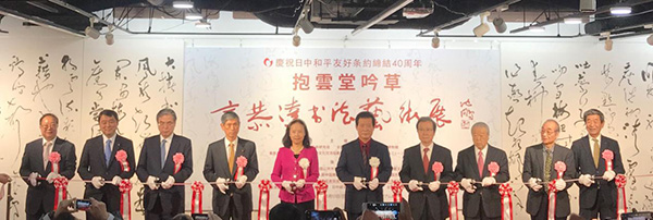 在日本中國大使館の程永華大使は今月6日、中國の書道家?言恭達(dá)氏の作品展「抱雲(yún)堂吟草——言恭達(dá)書法蕓術(shù)展」の開幕式に參加した。開幕式には、日本自民黨元副総裁の高村正彥氏や産経國際書會の最高顧問で、國蕓書道院會長の齋藤香坡氏、読売書法會常任理事の高木聖雨氏、全日本華僑華人聯(lián)合會名譽(yù)會長の顔安氏、日中文化交流促進(jìn)會理事長の劉洪友氏、清華大學(xué)教授で、中國書道家協(xié)會顧問の言恭達(dá)氏、日本書道団體代表、華僑華人団體、中國系機(jī)関の代表などおよそ200人が出席した。