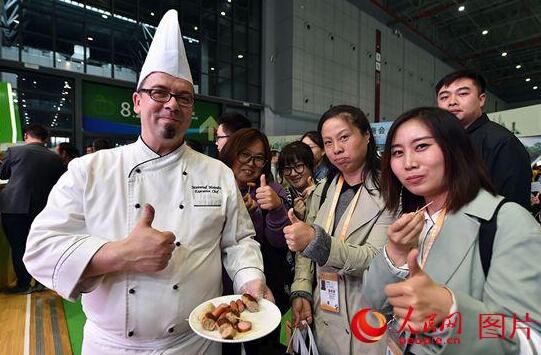 11月8日、輸入博覧會のドイツの食品グループの展示コーナーで、ドイツ製フランクフルト焼きに來場者が舌鼓を打っていた。(撮影:翁奇羽)