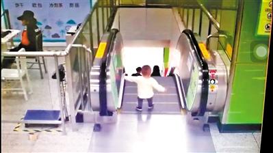 男の子は、プラットホームに通じる下りエスカレーターの前までやって來(lái)ると、エスカレーターが下っていく様子に興味を覚えたようで、ステップに一歩足を踏みだしたところ、うっかり転んでしまい、エレベーターの上に倒れてしまった。