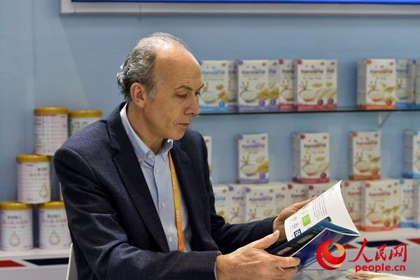 中國國際輸入博覧會に出展するために作り直したカタログをチェックする英國の粉ミルクメーカーのマクマホンCEO(撮影:人民網(wǎng)記者?翁奇羽)。