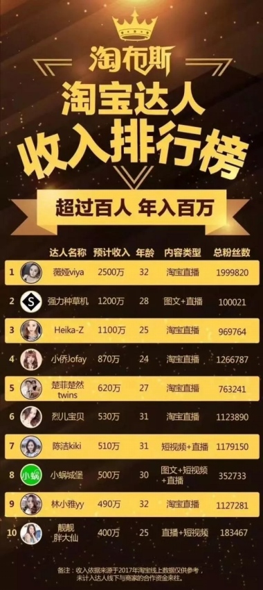 ライブコマース業(yè)者は、すでに決して侮れない商業(yè)界の新勢力になっている。淘寶は2017年、ネットライブパーソナリティーから淘寶にもたらされるマージン収入にもとづく「淘寶達(dá)人収入ランキング」を発表した。VIYAさんは、年収2500萬元でランキング首位に立った。これにより彼女はまぎれもなく、「商品販売クイーン」となった。続く第2位の達(dá)人は、年収1200萬元の「強(qiáng)力種草機(jī)」さん。第2位とわずかの差で第3位となったのは、年収1100萬元の「Heika-Z」さんだった。