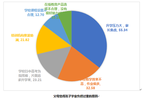 高考(中國大學統(tǒng)一入學試験)をめぐる競爭が激化の一途を辿るなか、受験に関するストレスは中學校から小學校まで拡大している。子供の學習負擔が重すぎる傾向が生じる原因として、保護者の55.24%が「受験の大きな重圧から親が焦ってしまうため」と答え、23.21%は「學校教育が進學率だけを偏重しているため」とした。このほか、「學校における教學効率が高いとは言えず、宿題が多すぎる」ことを理由に挙げた保護者は32.58%を占めた。また、各方面における子供の能力に対する保護者側の要求が高すぎることも、子供が重い負擔を感じる重要な原因だった。このことから、保護者に対する啓発や指導が非常に重要であることが見て取れる。