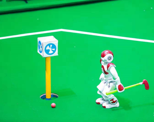 ロボットゴルフはロボット業(yè)界ではお馴染みの競(jìng)技で、ロボットが獨(dú)自にカップの位置、球の位置、ゴルフ?qǐng)鋈wの環(huán)境を認(rèn)識(shí)することで、自分?カップ?穴の位置を決めるとともに、ロボットは球の位置により自分が立つ位置を調(diào)整し、かつショットの動(dòng)作を自動(dòng)的に調(diào)整し、カップに入れなければならない。學(xué)生にとっては、プログラミングによりロボットの動(dòng)きの精密な制御、物體の識(shí)別、ルート計(jì)畫、測(cè)位?ナビ、さらには音聲認(rèn)証を?qū)g現(xiàn)することが、技術(shù)的に非常に難しい課題となる。今回のコンテストにおいて、南京郵電大學(xué)通達(dá)學(xué)院のチームが、15分3秒の間に、わずか6打で上中下の難易度をクリアし優(yōu)勝を果たした。