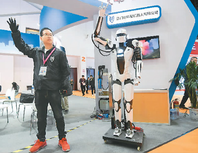 出展企業(yè)のスタッフがバイオニクスロボットをコントロールし、デモンストレーションする様子。