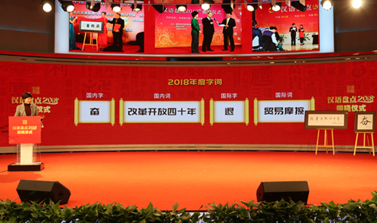 中國(guó)國(guó)家語(yǔ)言資源モニタリング?研究センターや商務(wù)印書館、人民網(wǎng)、騰訊(テンセント)などが共同で主催する「2018年今年の漢字?流行語(yǔ)(漢語(yǔ)盤點(diǎn)2018)」の発表セレモニーが21日、人民日?qǐng)?bào)社ニューメディアビルで開催された。今年の漢字には「奮」、今年のワードには「改革開放四十年」が選ばれた。世界の今年の漢字には「退」が、世界の今年のワードには「貿(mào)易摩擦」が選ばれた。人民網(wǎng)が報(bào)じた。