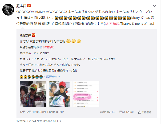 クリスマス前日、羅志祥の微博にそんな憧れのキムタク本人からコメントが寄せられた。コメントでキムタクは羅志祥に対して感謝の気持ちを示しただけでなく、素?cái)长圣辚攻蕙工摔胜毪瑜Δ摔趣违幞氓哗`ジも。こんな「クリスマスプレゼント」に當(dāng)の本人である羅志祥はもちろんのこと、ネットユーザーも騒然となった。羅志祥はすぐさま日本語(yǔ)でキムタクに感謝のメッセージを送っただけでなく、自分のファンたちに向けて、「みんな見(jiàn)て!なんとキムタクから返事が!スターの追っかけをしているみんなも諦めずに頑張ってね!」と勵(lì)ましのコメントを綴った。(編集YF)