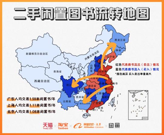 閑魚が描き出している「知識の流動地図」を見ると、多くの図書が沿海の省?市から中?西部の省?市に移動している。うち、18年、流入した図書が最も多かった都市トップ5は、四川省、重慶市、湖北省、湖南省、河北省だった。