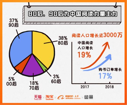 「読書報告」によると、「90後(1990年代生まれ)」は依然として中國の読書の主力軍となっている。18年、天貓と淘寶で本を購入した人のうち、「90後」は37%を占め、38%の「80後(80年代生まれ)」とほぼ肩を並べている。