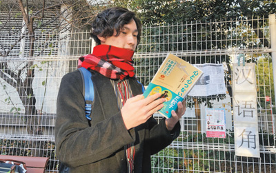 「心と心つないだ餃子」を読む慶応大學の學生 (撮影?劉軍國) 。