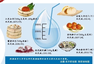 學生たちはまず南京のさまざまな料理をまとめて、そのレシピを作り、さらに肉料理と野菜料理、各種デザートに分類。彼らはすべての料理に使われる食材の種類、用量、これらの料理の作り方の詳細な統(tǒng)計?整理を行った。また食材のウォーターフットプリントをブルーウォーターフットプリント(地表水もしくは地下水の消費量)、グリーンウォーターフットプリント(雨水の消費量)、グレーウォーターフットプリント(汚染物を吸収し特定の水質(zhì)基準を満たすため必要な淡水の量)に細分化。そして動物類農(nóng)産物、農(nóng)作物、調(diào)味料などに分け、食材のウォーターフットプリントデータ集を作成し、具體的には牛と牛乳、豚、羊、鶏と鶏卵、アヒルとアヒルの卵、ガチョウ、魚、コメ?とうもろこし、小麥?じゃがいも、ナッツ?香辛料など13種類に分けた。