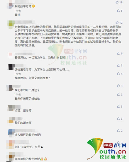 謝準教授の「ちょっといい話」に溢れた試験問題がネットに投稿されると、謝準教授の「並々ならぬ心配り」に対し、多くの學生から稱賛のコメントが寄せられた。(編集KM)