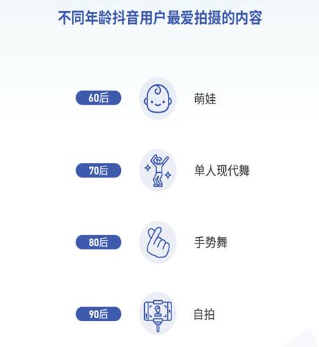 ユーザーの年代が異なると、撮影対象となるコンテンツも異なってくる。報(bào)告によると、「90後(1990年代生まれ)」のTik Tokユーザーは、自撮りによって自分の個(gè)性を表現(xiàn)することを好み、「80後(1980年代生まれ)」はフィンガーダンスが大好き、「70後(1970年代生まれ)」は、ソロのモダンダンスを好み、「60後(1960年代生まれ)」は、孫の成長を記録するのに夢中になっている。各年代の人々が、Tik Tokを使って、日常生活の「素晴らしい瞬間」を記録、発信している。