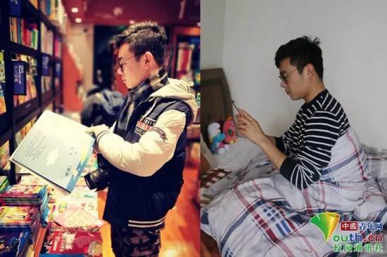 河北大學(xué)の學(xué)生、蘆猛さんの帰省前と帰省後のビフォーアフター畫像。「帰省前は文蕓青年をきどって、カメラにコーヒーに図書館通い。帰省後は、顔も頭も洗わず、布団にくるまりスマホにおやつ三昧」と蘆さん。