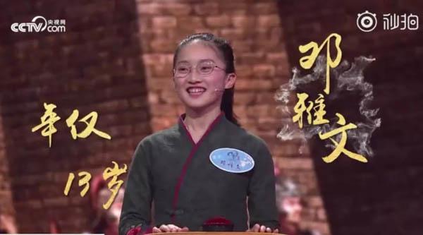 中國(guó)中央テレビ(CCTV) の視聴者參加型の漢詩(shī)をテーマにした人気番組「中國(guó)詩(shī)詞大會(huì)(Chinese poetry Conference)」シーズン4では、鄧雅文さん(13)が4回連続で勝ち抜き、第6回では陳瀅さん(12)が漢詩(shī)に関する博學(xué)ぶりを披露し、微博(ウェイボー)の話題をさらった。このようにシーズン4では、子供たちが大活躍して視聴者を魅了している。 北京日?qǐng)?bào)が報(bào)じた。