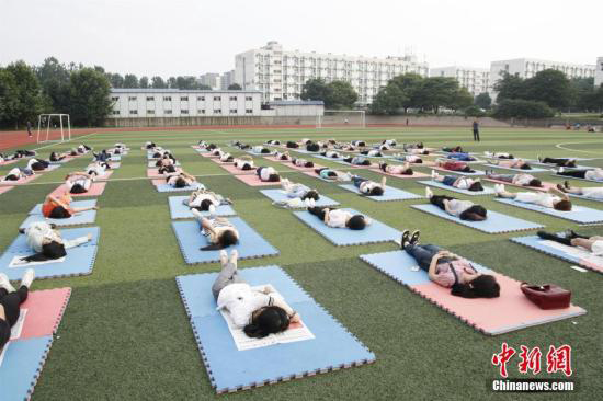 睡眠の質(zhì)に対する関心を高めることを呼びかけるため「グラウンドで眠る」女子大生たち(撮影?劉湧志)。