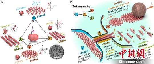 微遊動ロボットの群れのマルチモード転化(左)、環(huán)境への反応と群れの動き(右)