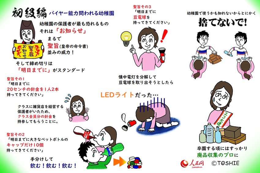 ほとんどが共働きの中國の親たちにとって、子供が幼稚園に上がったら、ようやく手がかからなくなるのではないかと、淡い期待を抱いてしまうのも無理はない。しかしそんな期待はあまりにもはかないものだったとすぐに気づくことになる。まず中國の幼稚園において「お知らせ」というものが事前に屆くことがまず無い。たいていその締め切りは「明日までに」だ。さらに準(zhǔn)備しなければいけない「ブツ」がまたすぐには揃えられないものだったりすることもしばしば。親たちはこうした「お知らせ」におびえながら、クライアント(幼稚園)の要求を満たすバイヤー能力を磨いていく。そして空き箱、空き瓶類はとにかく捨てずにとっておくという素晴らしいエコ精神もこの幼稚園時(shí)代に養(yǎng)われる。