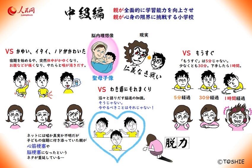 小學(xué)校では幼稚園のような「お知らせ」は少なくなるが、「宿題」という大きな試練がやってきて、親と子供の「仁義なき戦い」の火ぶたが切られる。日本の親の場合、せいぜい「宿題をやりなさい」の一言だが、中國の親たちは「結(jié)果(宿題を提出する)」を重視するが故、「過程(宿題を自分でやる)」は二の次になり、つきっきりで一緒に宿題をすることになる。もちろんそうしなければ終わらないほどの難しさと量の多さもその原因の一つであることは否めない。そんな教育制度の問題はさておき、宿題は國語に算數(shù)、英語の3教科はもちろん、作文や手抄報(bào) (1枚の紙にイラストや文で作成するレポート)、様々なテーマの資料集めなど全面的な學(xué)習(xí)能力とリサーチ能力が問われることになる。親たちは検索エンジンの「百度」を駆使することを覚え、家にはプリンターを常備し、スマホには次々と宿題お手伝いアプリがダウンロードされていく。「最低限、宿題だけでも終わらせる」ということがどれだけ苦しみに満ちたものなのか、子供も大変だが、親も心身の限界に挑戦することになるのが小學(xué)校時(shí)代だ。