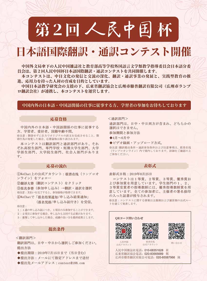 中日文化の伝播と交流を深め、翻訳通訳事業(yè)の発展を促進(jìn)し、実踐型教育を推進(jìn)し、実踐的応用力をもった人材を育成するために、中國外文局に屬する人民雑誌社と教育部外國語言文學(xué)類教學(xué)指導(dǎo)委員會日本語分委會は、第二回人民中國杯日本語國際翻訳コンテストを共同開催します。