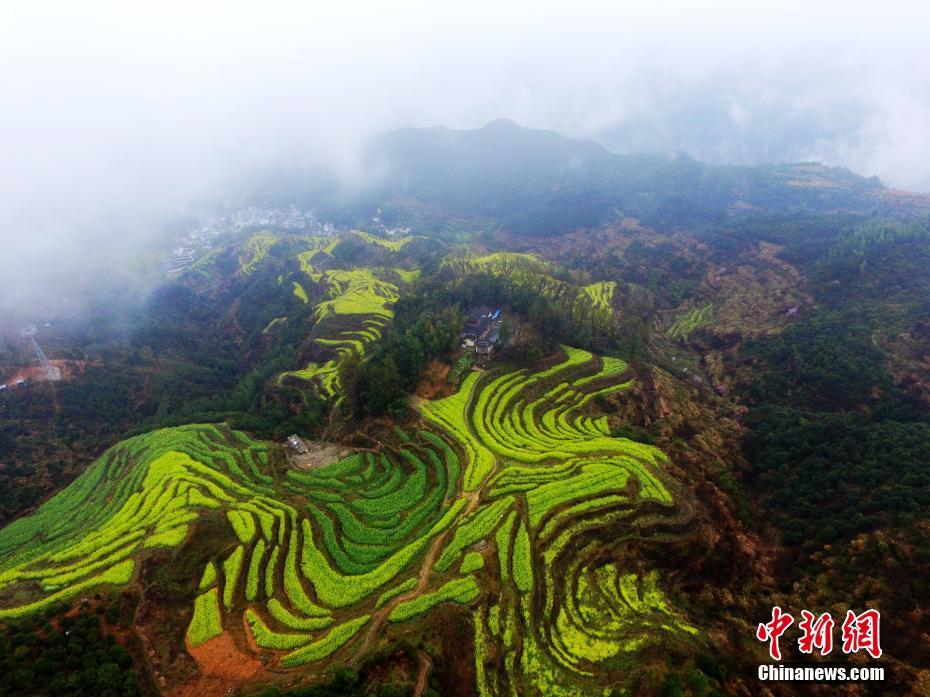 (中)陽春三月,航拍萬畝花海梯田層層疊疊,在云霧繚繞中若隱若現(xiàn),十分壯觀。