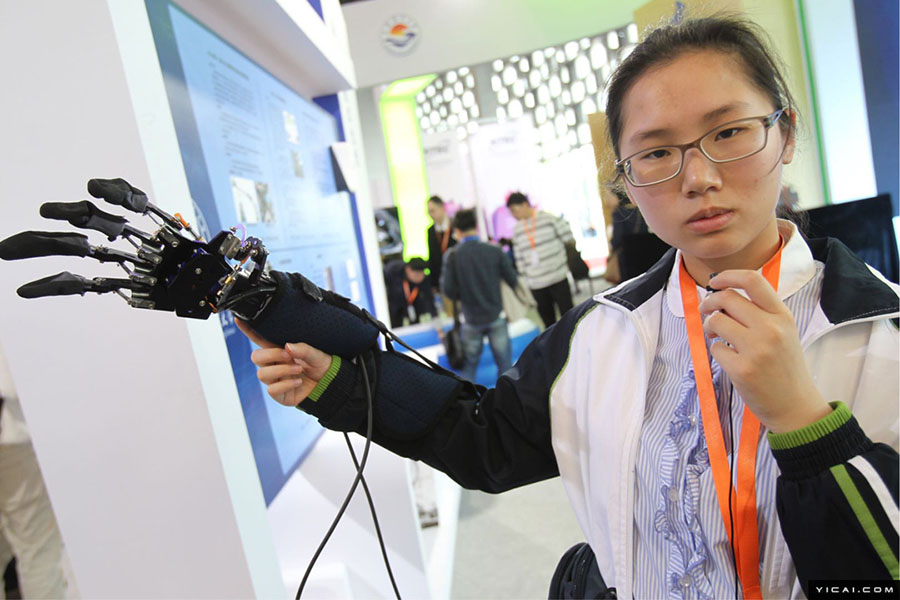 この義手は上海市虹口區(qū)青少年活動(dòng)センターの學(xué)生グループが設(shè)計(jì)。ユーザーは、義手を腕に裝著し、マイクを使って音聲でコントロールし、物を摑んだり、置いたりすることができる。畫(huà)像はD-Arm音聲コントロール義手。
