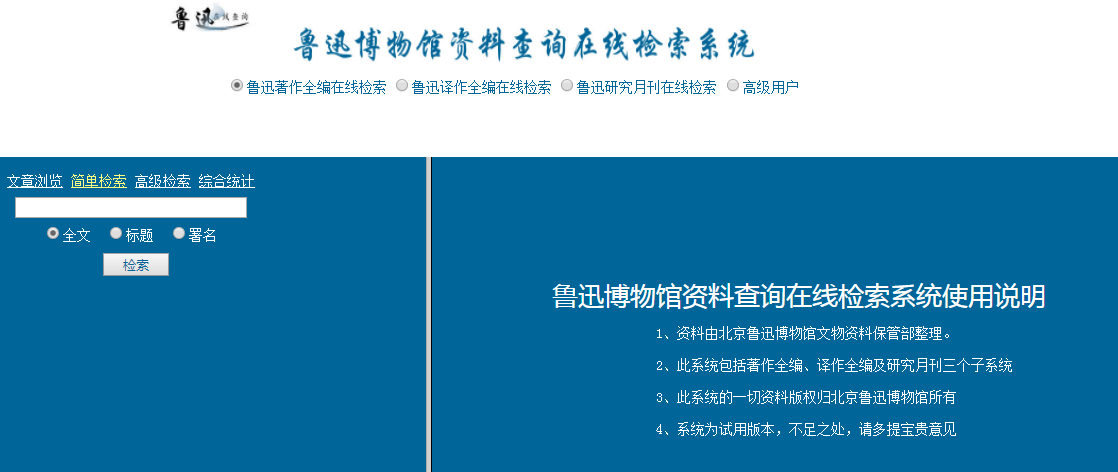 この検索システムでは、「文章閲覧」、「簡(jiǎn)単検索」、「詳細(xì)検索」、「総合統(tǒng)計(jì)」という4種類の検索方法に分かれており、ネットユーザーの間で話題になっている「魯迅が語(yǔ)った言葉」の検索は、この中の「簡(jiǎn)単検索」を使って行うことができる。