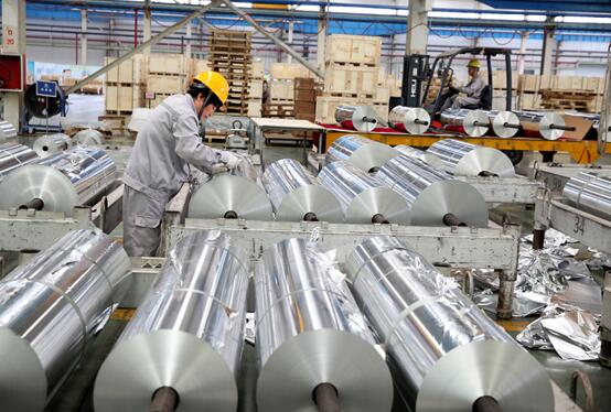 2019年4月25日、安徽省淮北市■(さんずいに目と隹)渓県の経済開発區(qū)にあるアルミニウムベース新材料の基地で、アルミ関連企業(yè)の作業(yè)員がまもなく輸出される小型高級アルミコイルを點(diǎn)検している様子。(畫像提供:人民図片)