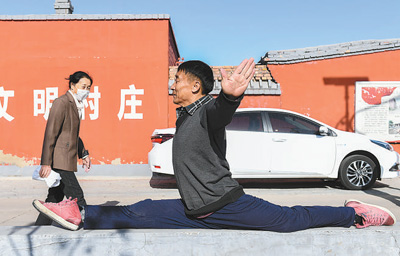 村の広場(chǎng)で前後180度開(kāi)腳を練習(xí)する劉子青さん。