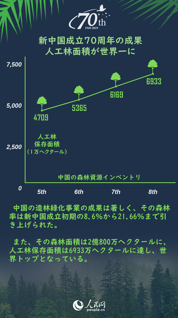 また、その森林面積は2億800萬(wàn)ヘクタールに、人工林保存面積は6933萬(wàn)ヘクタールに達(dá)し、世界トップとなっている。