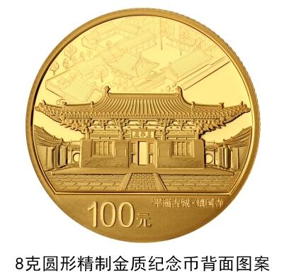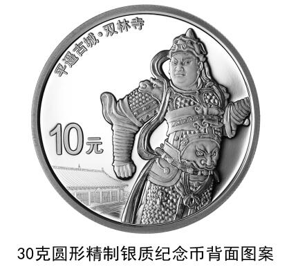 記念硬貨のデザインに関して、金?銀の記念硬貨の表側(cè)のデザインはいずれも平遙古城の迎薫門の外観となっており、國名と発行年が刻印されている。裏面のデザインはそれぞれ異なり、150グラムの丸い金の記念硬貨には平遙古城の典型的な景観、「平遙古城」という文字と額面が刻印されている。8グラムの丸い金の記念硬貨には鎮(zhèn)國寺萬仏殿の外観と鎮(zhèn)國寺の全景を組み合わせたデザインがあしらわれ、「平遙古城?鎮(zhèn)國寺」という文字と額面が刻印されている。30グラムの丸い銀の記念硬貨には雙林寺韋駄天像と天王殿の外観を組み合わせたデザインがあしらわれ、「平遙古城?雙林寺」という文字と額面が刻印されている。