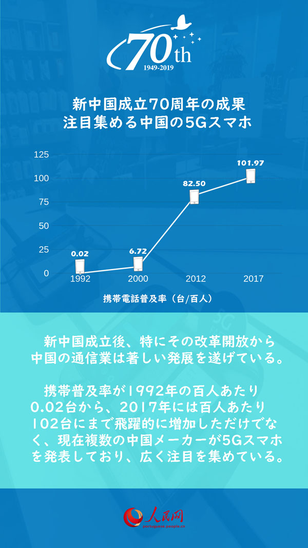 攜帯普及率が1992年の百人あたり0.02臺(tái)から、2017年には百人あたり102臺(tái)にまで飛躍的に増加しただけでなく、現(xiàn)在複數(shù)の中國(guó)メーカーが5Gスマホを発表しており、広く注目を集めている。