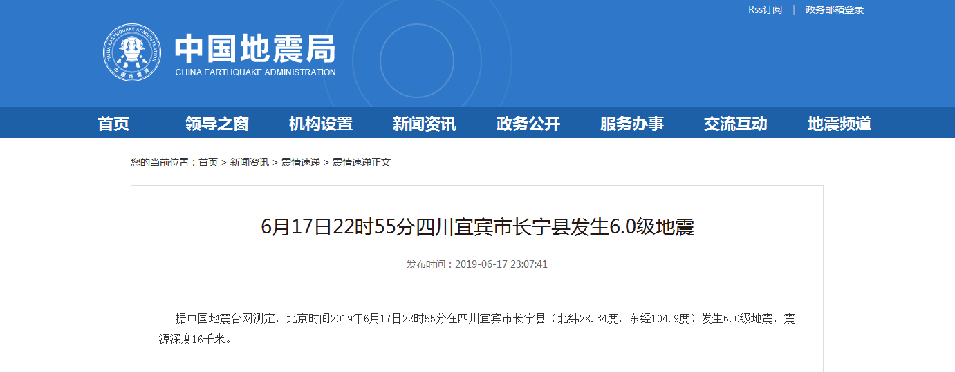 中國地震臺網(wǎng)の測定によると、今回は四川盆地南部で北京時(shí)間2019年6月17日に地震が発生した。震源地は四川省南部の宜賓市長寧県で、マグニチュードは6.0。そのため今回の地震の正式名稱は「2019年6月17日四川長寧M6.0地震」で、略稱は「四川長寧M6.0地震」になる。(編集YF)