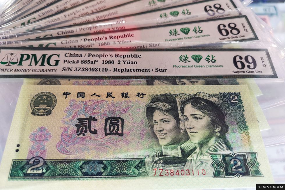 1980年に発行された第4版人民元の2元紙幣。蛍光発光インクを使用した紙幣は裏側(cè)を蛍光燈にかざすと緑色の「田」の字のデザインが浮かび上がり、ダイヤモンドの粒のように見えることから、「グリーンダイヤ」と呼ばれている。米鑑定機関のPMG社により69級に認(rèn)定された。
