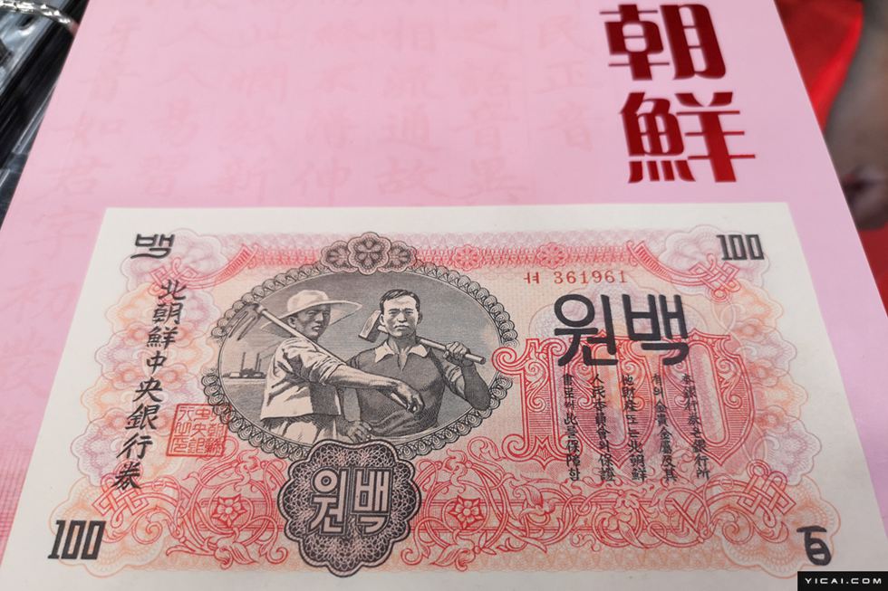 1947年に発行された朝鮮の第1版朝鮮ウォンの100ウォン。當(dāng)時(shí)のソビエト連邦が印刷を請け負(fù)い、紙の原材料と印刷技術(shù)は中國の第2版人民元と同じものが使われ、漢字中心の券面をもつ朝鮮で唯一の紙幣セットだ。