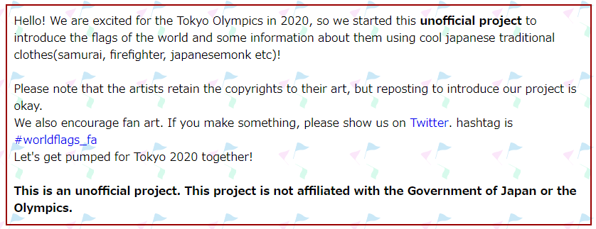 「ワールドフラッグス」トップページには、今回の活動について「2020年東京オリンピックに向けて、當(dāng)サイトでは今回の非公式活動を通じて、侍や僧侶などの日本の伝統(tǒng)的な和裝と各國の國旗の要素や文化を掛け合わせることで、各國の國旗を擬人化し、キャラクターを作成した」としており、トップページには英語の太字で特に「このサイトは公式プロジェクトではなく、本プロジェクトと日本政府またはオリンピックとは何の関係もない」と明記されている。