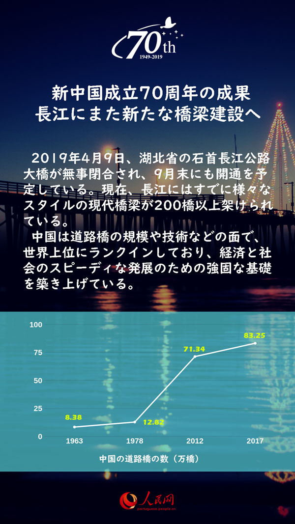 2019年4月9日、湖北省の石首長(zhǎng)江公路大橋が無(wú)事閉合され、9月末にも開(kāi)通を予定している?,F(xiàn)在、長(zhǎng)江にはすでに様々なスタイルの現(xiàn)代橋梁が200橋以上架けられている。中國(guó)は道路橋の規(guī)模や技術(shù)などの面で、世界上位にランクインしており、経済と社會(huì)のスピーディな発展のための強(qiáng)固な基礎(chǔ)を築き上げている。